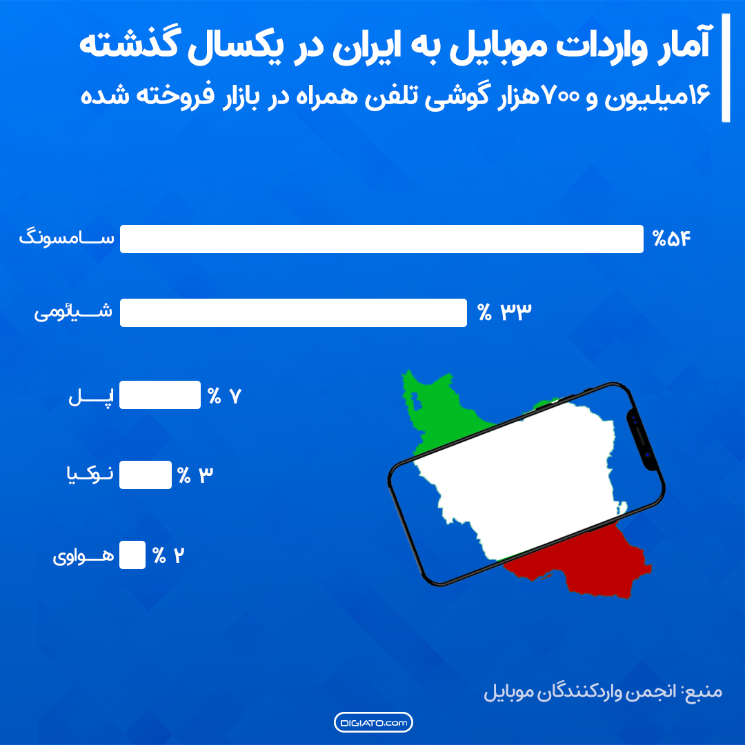 طبق آمار منتشر شده از سوی انجمن واردکنندگان موبایل سامسونگ، شیائومی و اپل بیشترین سهم را از بازار ایران دارند و البته بیش از ۸۵ درصد بازار متعلق به گوشیهای شیائومی و سامسونگ است. همچنین این آمار حکایت از ثابت ماندن تقریبی میزان واردات گوشی به کشور نسبت به سال گذشته دارد.