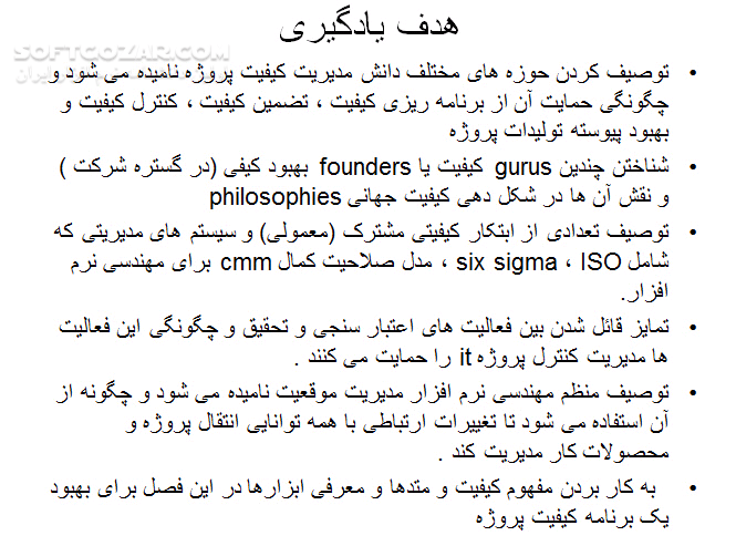 توصیف تعدادی از ابتکار کیفیتی مشترک (معمولی) و سیستم های مدیریتی که شامل ISO ٬ six sigma ٬ مدل صلاحیت کمال cmm برای مهندسی نرم افزار.