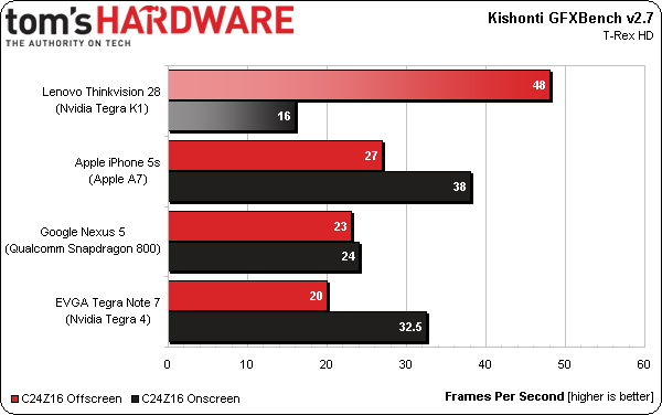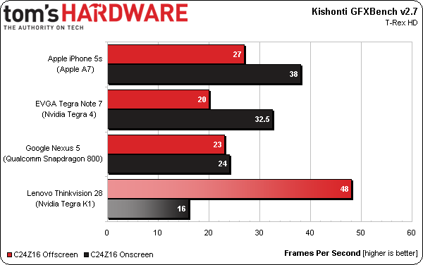 لازم به ذکر است که این تست ها بر روی Lenovo Thinkvision 28 با نمایشگر 4K صورت گرفته که بر اساس اخبار منتشر شده، فرکانس هسته های کپلر و نیز Cortex A15 در این نمونه پایین تر از حداکثر توان Tegra K1 ست شده بودند. اما با این حال این پردازنده به خوبی از پس میلیاردها پیکسل نمایشگر 4K برآمده!