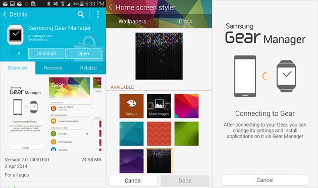 زمانی که با بلوتوث وصل شدید، باید برنامه «مدیر گیر» Gear Manager را از فروشگاه خود سامسونگ دانلود کنید و سپس دستگاه آماده کار میشود. هشدار: روزهای اول بخش عمدهای از روز خود را در برنامه مدیر گیر به سر خواهید برد. از اینجاست که میتوانید ظاهر ساعت را عوض کنید، تقریباً تمامی تنظیمات آن را تغییر دهید و برنامههای موجود را دانلود کنید. اغلب تغییر تنظیمات از طریق برنامه روی گوشی سریعتر از تغییر آن به واسطه خود ساعت است. البته تغییر دادن تنظیمات مستقیماً به واسطه خود ساعت دشوار نیست، اما به مرور زمان احساس خواهید کرد که این کارها را روی گوشی راحتتر میتوانید انجام دهید.