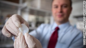 «لورنس بناسار» استاد مهندسی زیست‌پزشکی دانشگاه «کورنل» و یک گوش مصنوعی ساخته‌شده از طریق چاپ سه‌بعدی و مواد قابل تزریق