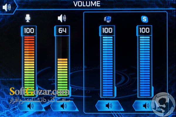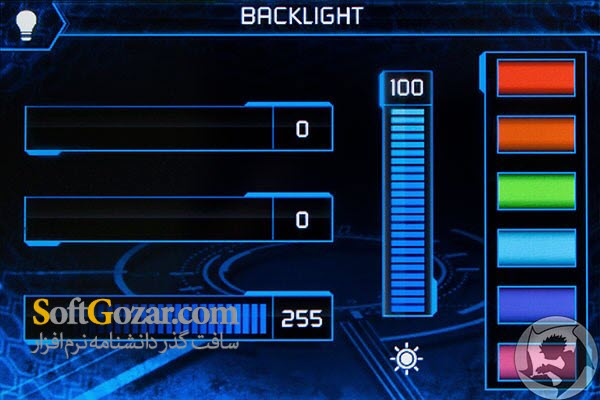 سافتگذر ؛ در تصاویر بالا نمونههایی از تنظیمات صدا میبینیم که با انتخاب این کاربرد به نمایش درمیآید. نمونهای نیز از کنترل نور وجود دارد که «نوردهی» صفحهکلید را کنترل میکند. از دو طریق میتوان رنگ موردنظر را برگزید: اولاً از میان موارد پیشفرض و دوماً از میان 16 میلیون رنگ RGB.