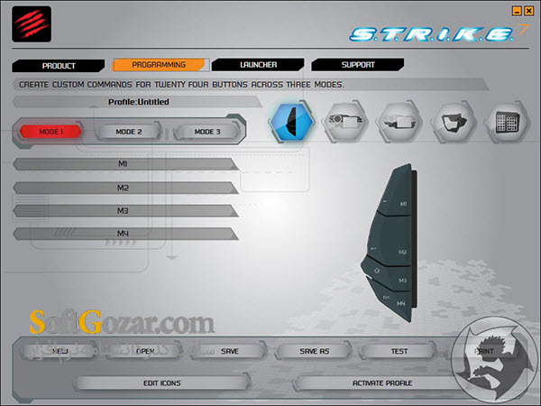تب «برنامهدهی» Programming هم میتوان به صورت دستی فرامین را تعیین کرد و یا بستههای مخصوص بازی را مستقیماً از سایت مد کتس گرفت. در این بستهها، پروفایلهای مربوط به غالب بازیهای محبوب و معروف قرار داده شده است، از تیراندازی اولشخص گرفته تا نقشآفرینی آنلاین چندنفره MMORPG.