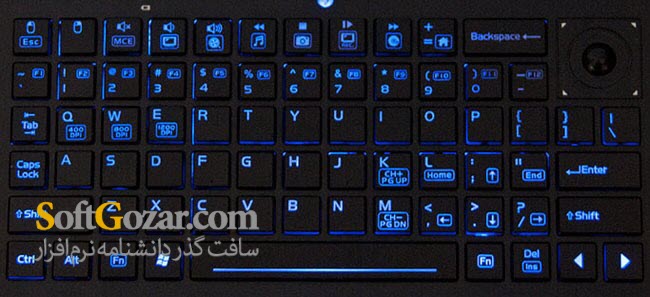 همه کلیدها، نور پسزمینه آبی رنگی دارند که با سنسور نور بالای کلیدهای مدیا کنترل میشود. همچنین نور پسزمینه کلیدها را میتوان با کلیدهایی که در زیر دستگاه تعبیه شده به کلی خاموش کرد. این طراحی میتوانست با یک سنسور قابل تنظیم برای نور پسزمینه بهبود یابد، چرا که در حال حاضر بایست تاریکی مطلق باشد تا نور پسزمینه فعال شود. همچنین یک ایراد هم در باتریها وجود دارد: نور پسزمینه با باتریها کار نمیکند. مسئله مهمی نیست، ولی اول فکر کردم که صفحهکلید ایراد دارد. بعلاوه رنگ آبی برای نور پسزمینه رنگ خوبی نیست چراکه وقتی روشن میشود کنتراست نور برای دیدن کلیدها کافی نیست. باید به صفحه کلید خیره شد. در مورد کاربری صفحهکلید کمی جلوتر صحبت خواهیم کرد.