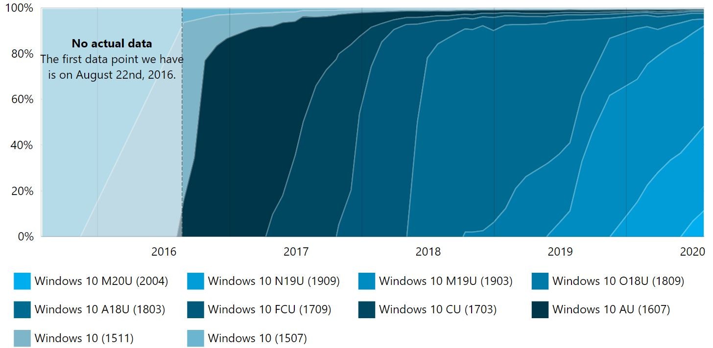 البته تعداد کاربران نسخه های 1903 از 46.2 به 43.6 درصد کاهش و 1909 از 35.7 به 36.8 درصد افزایش پیدا کرده اند. ورژن 2004 هم از 7 به 11.6 درصد رسید. نسخه 1809 هم بیش از 2 درصد (از 5.9 به 3 درصد) کاربرانش را از دست داد. در نهایت نسخه های 1803 و 1709 هم به ترتیب 2.5 و 0.8 درصد کاربر دارند.
