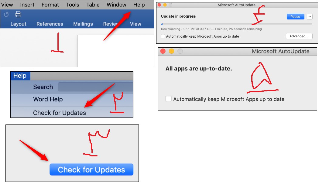 حالا پنجره Microsoft AutoUpdate ظاهر خواهد شد. از پایین سمت راست، آپشن Check for Updates را بزنید.