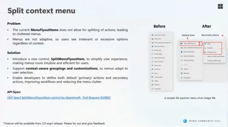 مایکروسافت در این نشست از کنترل جدیدی به نام SplitMenuFlyoutItem سخن گفت که هدف آن، رفع مشکل منوهای زمینهای عظیم و شلوغ است. این کنترل به توسعهدهندگان اجازه میدهد تا «زیرمنوهای ترکیبی» ایجاد کنند.