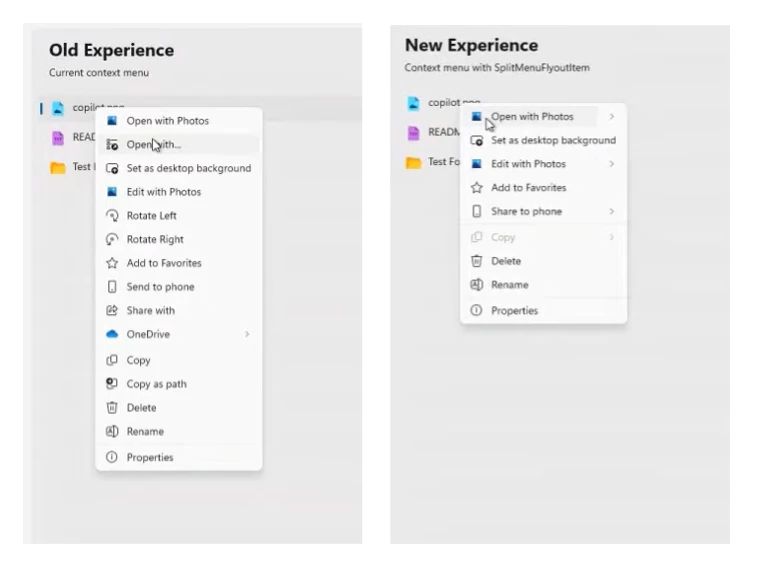 برای مثال، در «File Explorer» این رویکرد میتواند گزینههای «باز کردن» و «باز کردن با» را در یک ورودی واحد ترکیب کند.