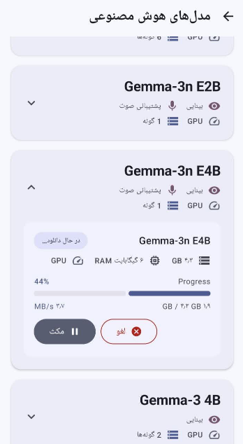✔️ هنگام دانلود مدلها در برنامه، معمولاً از شما پرسیده میشود که پردازش را روی CPU یا GPU انجام دهید — برای سازگاری بهتر و اجرا روی بیشتر دستگاهها پیشنهاد میشود CPU را انتخاب کنید.